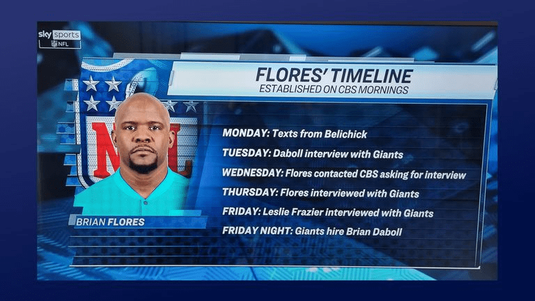 After Coach Flores departed, he had multiple interviews for head coaching vacancies in the league. When the Giants released Joe Judge, Flores was among those considered for the position as head coach. Three days before his interview, his former coach, Bill Belichick, sent him a congratulatory text on getting the job. Being confused about the message, Flores wanted to confirm that Coach Belichick was texting the right person. After Flores reached out to him, Belichick realized that he congratulated the wrong guy, and it was Brian Daboll who was getting the job. Flores had not even been interviewed yet. Despite the news from Belichick, Coach Flores went to the scheduled interview as a show of professionalism, assuming that the only reason he got the interview was because he was the minority candidate and the Giants needed to comply with the Rooney Rule.