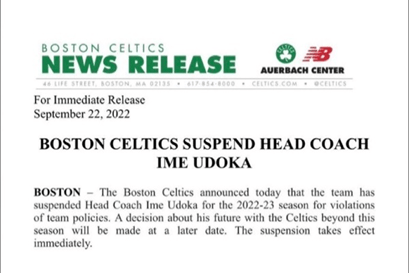 It is imperative to state that before this saga, Udoka had been a huge part of the success story of the Boston Celtics since he joined the team after stints with the San Antonio Spurs, Philadelphia 76ers, and Brooklyn Nets. His Celtics’ team recorded wins last season over the Brooklyn Nets, Milwaukee Bucks, and Miami Heat to win the Eastern Conference title. He guided them to the NBA Finals but lost in Game 6 to the Golden State Warriors, becoming the fifth coach in the last 25 years to make the Finals in his first year. He also secured a fourth-place finish in Coach of the Year voting. After a stellar outing last season, the fans had high hopes. They looked forward to a new season expecting the team to continue from where they left off last season, but this time it will be without head coach Ime Udoka.