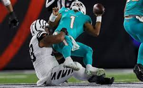 The following week, 4 days later, on Thursday Night Football, against the reigning AFC champion Cincinnati Bengals, the Dolphins were down 6-7 in the 2nd quarter with 6 minutes left and had a 2nd and 7 situation. Tua faked a hand-off to running back Raheem Moshert when the pocket collapsed, and he was sacked and thrown hard to the ground by the 6 foot 3, 340-pound Nose Tackle Josh Tupou. Tupou grabbed Tua by the waist so that his head jerked backward hard and hit the turf immediately with force much greater than in the previous week. Tua eventually had to be carted off the field as his hands and fingers were visibly shaking on camera.