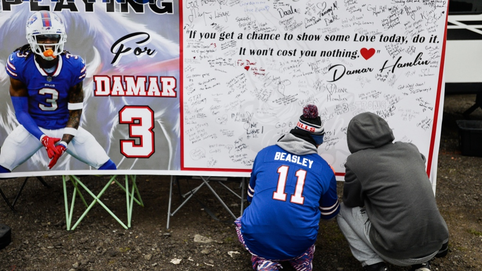 Caption: Bills fans sign a poster in support of Demar Hamlin’s recovery.